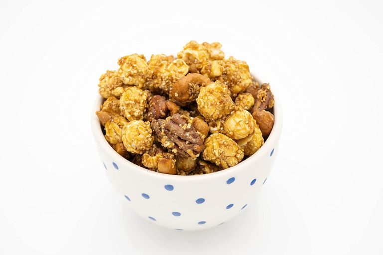 Slow cooked caramel coats a mix of popcorn, pecans, peanuts, almonds, and cashews for a sweet and salty snack that’s full of crunch.